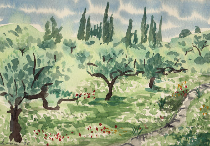 Aquarell: Gerold Lehmann - Olivenfeld im April nähe Kambos bei Kardamili Westliche